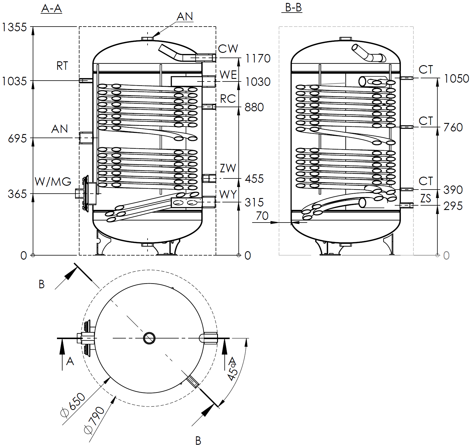 * 70°C; 55°C; 45°C - temp. wody grzewczej na wejściu do wężownicy