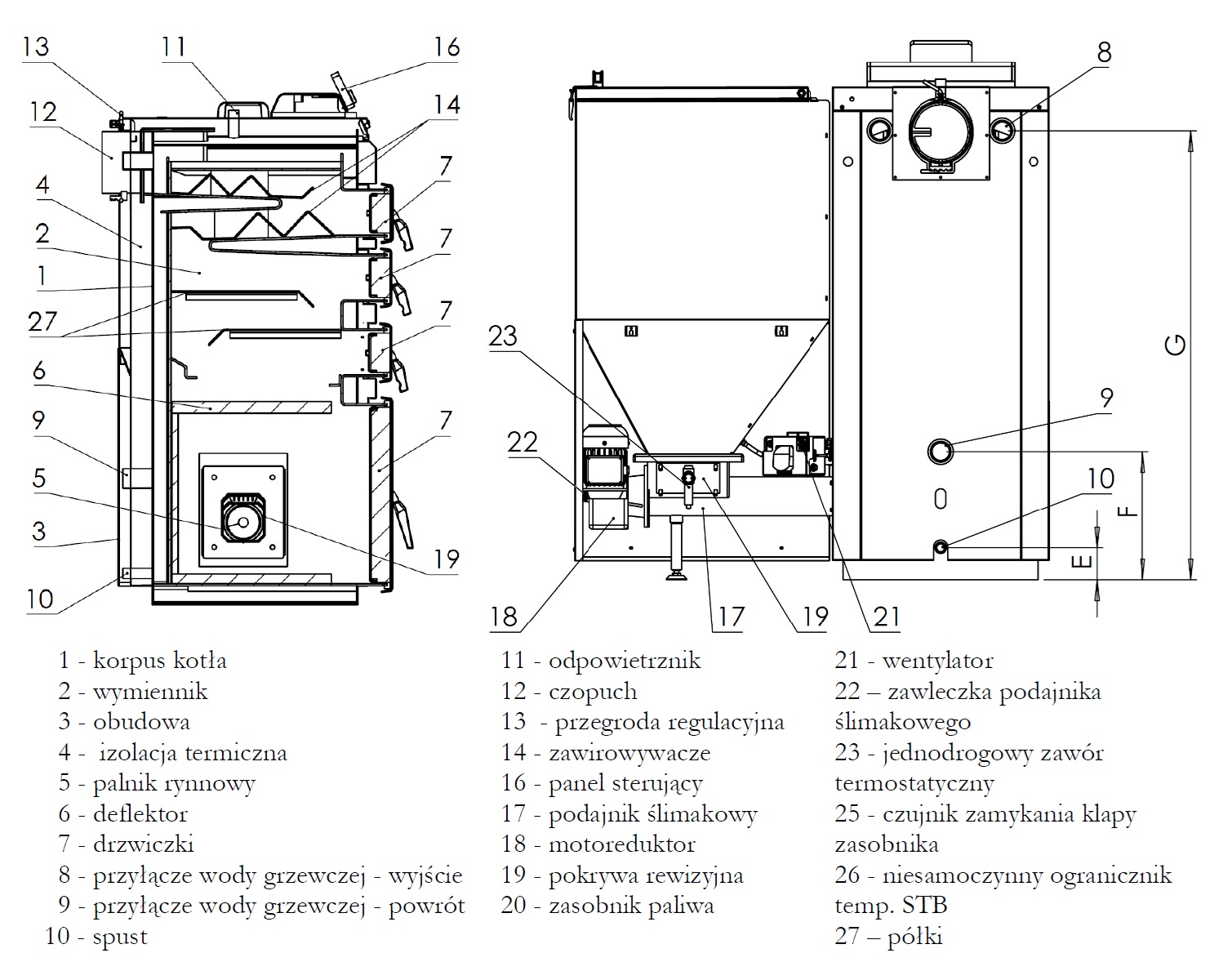 Czopuch spalinowy z przegrodą regulacyjną może być zamontowany na górnej lub tylnej ściance kotła. Przyłącza wodne znajdują się na tylnej ściance kotłów. Z przodu kotły wyposażone są w drzwiczki umożliwiające łatwy dostęp do wnętrza kotła w celu jego oczyszczenia oraz usuwania popiołu. W rurze podajnika ślimakowego znajdują się dodatkowe pokrywy rewizyjne (19), umożliwiające czyszczenie tych miejsc. Dla zmniejszenia strat ciepła cały korpus kotła oraz drzwiczki i dodatkowe klapy rewizyjne zabezpieczone są izolacją mineralną. Zewnętrzna obudowa kotła wykonana jest z blachy stalowej pokrytej trwałym lakierem proszkowym