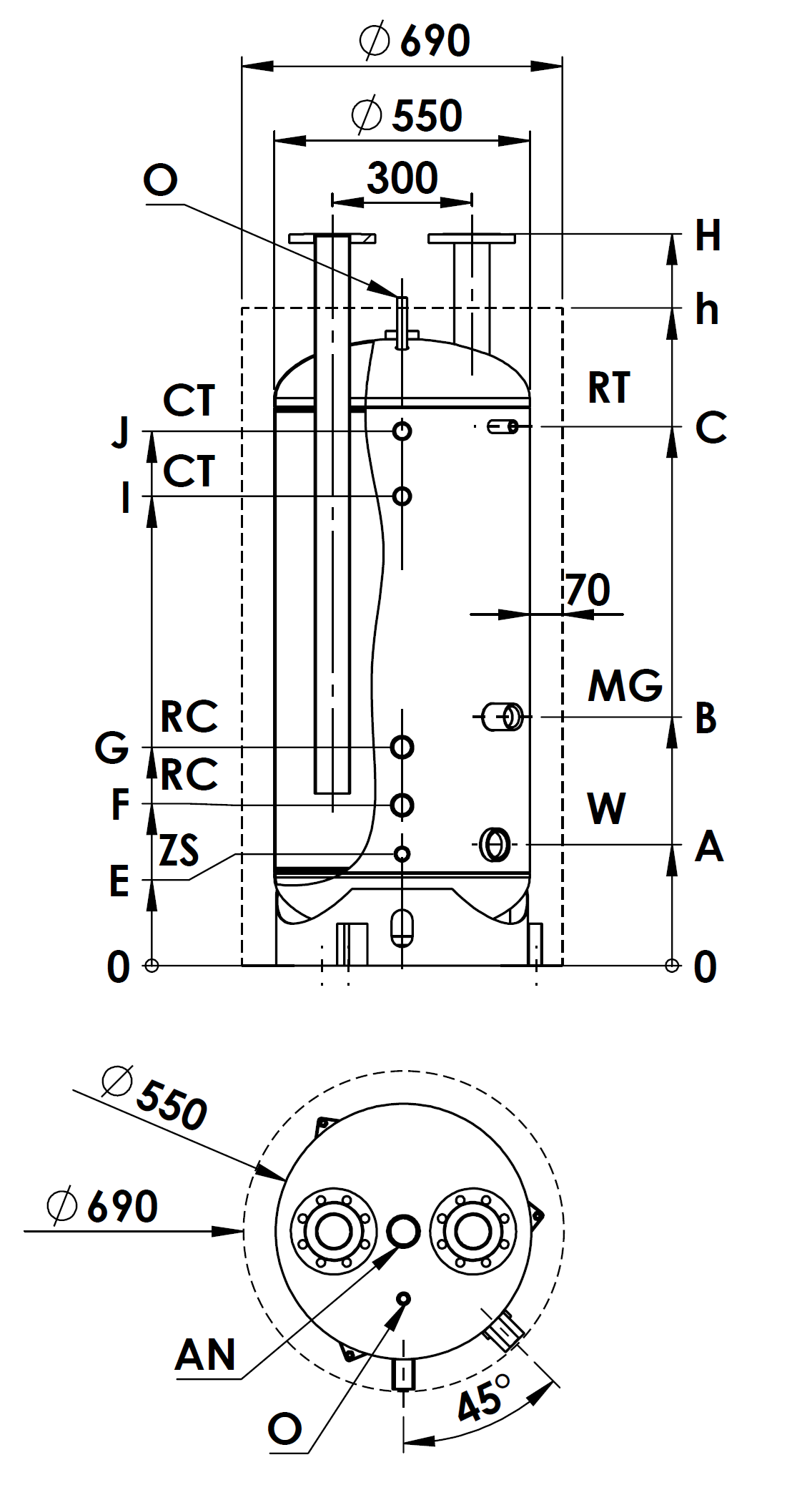 Rys. Budowa i wymiary zbiorników SCWA-E/G 100÷500.